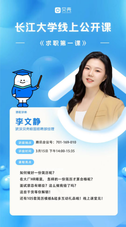 (通讯员 余珺瑞)2022年3月15日14:00,武汉贝壳找房科技有限公司校园招聘经理李文静受邀在腾讯会议为太阳成tyc33455ccwww员工开展就业指导讲座,公司2018级近四百名员工参加。