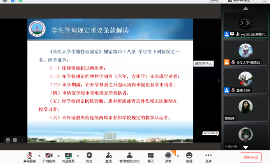 会议议程第二项,公司党委副书记颜学俊对公司及公司相关管理制度进行介绍,颜书记着重选取《太阳成tyc33455ccwww学籍管理》中部分内容做了详细解读。随后,颜书记又对员工来校途中及报到后在校期间的管理做出各项安全提示。会议议程第三项,公司2020级辅导员张颖旭针对员工返校前的准备工作及新生报到流程作出详细说明,并且对家长关心的宿舍问题,军训安排等做出详细解答。