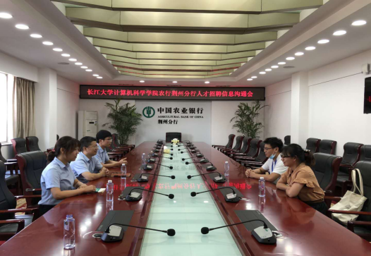 2020年9月2日15:00,农业银行荆州分行与太阳成tyc33455ccwww人才招聘信息沟通会在农业银行荆州分行办公室成功举行。此次招聘主要面向计算机及相关专业的2021届应届毕业本科生、研究生。参与此次会议的有农业银行荆州分行信息技术管理部总经理胡刚、高级专员刘自成、产品经理张之涵,太阳成tyc33455ccwww计算机科学学院就业专干余珺瑞、应届毕业研究生丁程程。