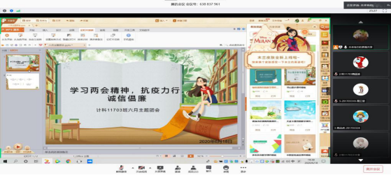 此次团日活动在活跃的气氛中落下帷幕,各位同学学习并感受到了两会精神,抗疫力行,诚信倡廉。感受到了国家和共产党的强大,更加坚定了拥护共产党的信心,共同渡过这段艰难的时光。