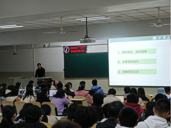 大会伊始,由极客班员工导员张优介绍本次会议的主讲人。大会第一部分由张智亮主讲,他持有多项专利,参加过诸多比赛并取得优异成绩。他首先给同学们提出殷切期望,希望同学们无论是工作还是读研,都要做到厚积薄发、踏实做事。接着,他向同学们介绍了四种写作技巧,并强调在写作过程中要做到简明扼要,学会运用书面化表达。同学们积极性颇高,主动学习并记录。最后,张智亮同学从论文专业比赛、项目创新比赛两方面向我们分享了竞赛经验。他指出,要针对各个方面的评委,多角度解释核心技术,并学会突出亮点,隐藏弱点。