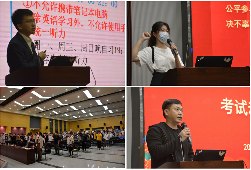紧接着,21级辅导员张颖旭公布了公司《2021级最新早晚自习管理办法》,并指出早晚自习考勤与综合测评直接关联,呼吁同学们认真对待早晚自习,不要在该奋斗的年龄选择安逸。随后,计科类32102班的高昕同学带领同学们进行了备战四级暨诚信考试宣誓。在同学们高涨的热情中,大会逐渐接近尾声。最后,由公司党委副书记颜学俊宣读《2021级本科生英语四级奖励办法》并做总结讲话。至此,本次大会圆满结束。
