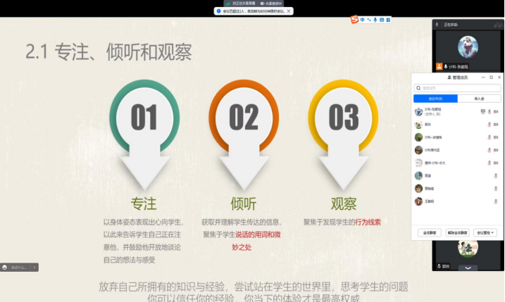 为帮助班主任、辅导员掌握谈心谈话专业技巧,不断推进心理育人工作实效,进一步做好2023级新生的心理访谈工作,计算机科学公司于10月20日上午10:00利用腾讯会议,开展谈心谈话专题培训。公司副经理詹炜、2023级本科生研究生新生辅导员及班主任参会,培训由公司心理专干张颖旭主持。