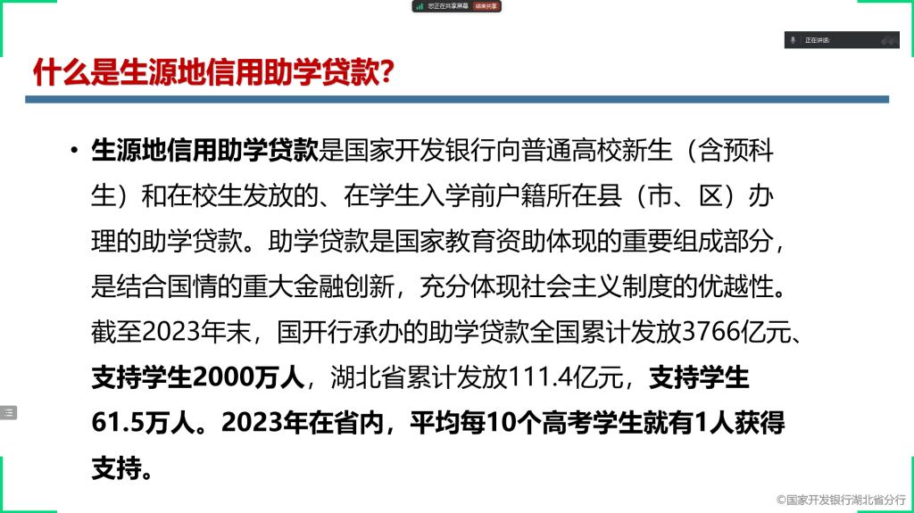 为深入贯彻落实国家资助政策,帮助家庭经济困难员工及家长全面了解生源地信用助学贷款相关事宜,确保家庭经济困难员工能够顺利入学并完成学业,太阳成tyc33455ccwww于9月15日在腾讯会议组织开展了2024-2025学年秋季学期生源地信用助学贷款政策宣讲活动。 活动伊始,公司负责资助工作的王鹏翔老师对生源地信用助学贷款政策进行了详细解读。围绕生源地信用助学贷款的申请条件、贷款额度、贷款期限、利息计算、还款方式以及申请流程等关键内容一一展开介绍。用通俗易懂的语言和生动具体的案例,深入浅出地为同学们答疑解惑,确保每一位在场同学都能清晰准确地理解政策细节。 除了对政策的宣讲与答疑,王鹏翔老师在活动中着重强调了资助育人的重要意义。指出生源地信用助学贷款不仅仅是一项经济援助政策,更是国家助力寒门学子实现梦想、成长成才的有力举措,希望同学们能够心怀感恩之心,珍惜来之不易的学习机会,在今后的学习生活中勤奋努力、积极进取,以优异的成绩回报国家和社会的关爱,将来也能够将这份爱心传递下去,去帮助更多有需要的人,真正将资助化作成长路上的动力,努力肩负起时代赋予的责任与使命。 此次生源地信用助学贷款政策宣讲活动,是2024-2025学年秋季学期资助育人工作的重要一环,通过活动的开展,进一步加大了国家资助政策的宣传力度,使更多员工受益于生源地信用助学贷款政策,同时也在员工心中种下了感恩与担当的种子,为公司后续资助育人工作的深入推进奠定了坚实基础。