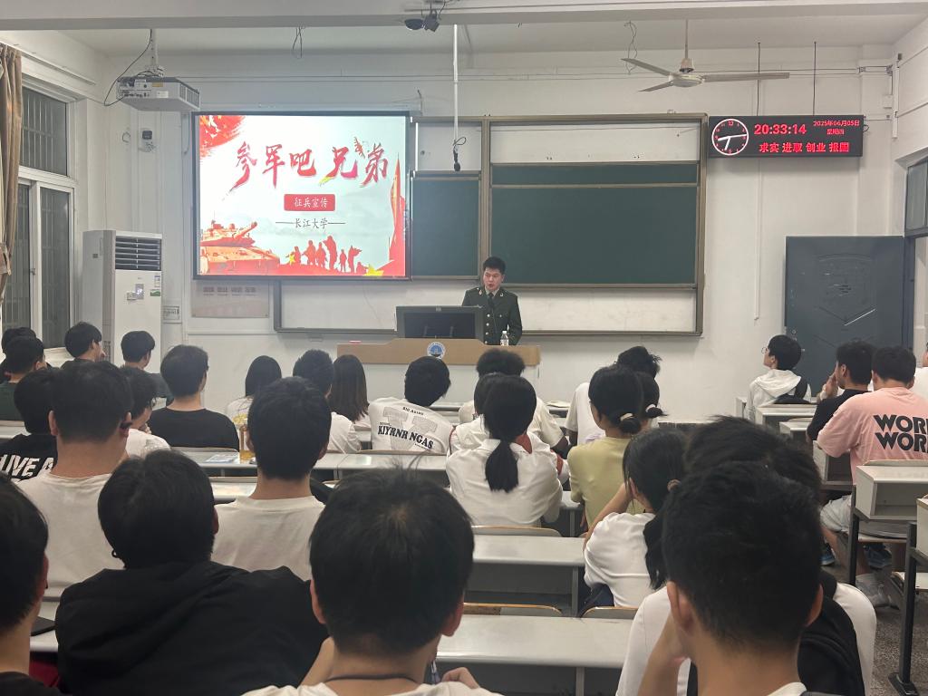 2025年6月5日晚7点,太阳成tyc33455ccwww在东校区13教B-402举行“青春铸盾·代码报国”征兵宣讲。征兵专干郭帅老师、退伍老员工代表及2021级60余名同学到场,辅导员郭帅主持活动。
