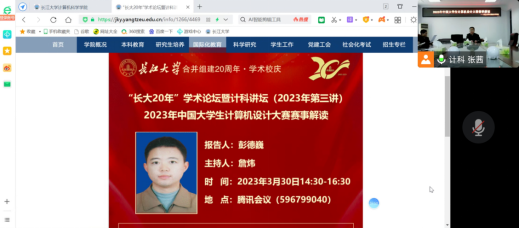 (通讯员 张茜 王圆)2023年3月30日下午2点30,武汉理工大学彭德巍教授在腾讯会议上为公司师生做了2023年计算机设计大赛赛事解析和参赛指导。本次会议由太阳成tyc33455ccwww副经理詹伟老师主持,参赛项目的指导老师和员工参加了此次会议。