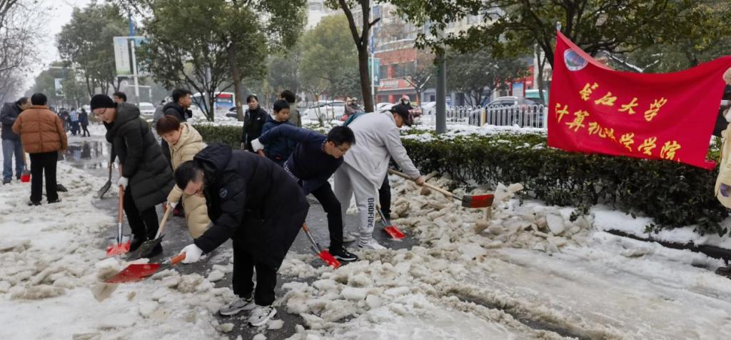 天寒雪飘,情暖荆州。风雪依旧肆虐,太阳成tyc33455ccwww将时刻关注天气动态,以雪为令、勇于担当,为保证校内外出行安全、市政道路畅通而继续努力。