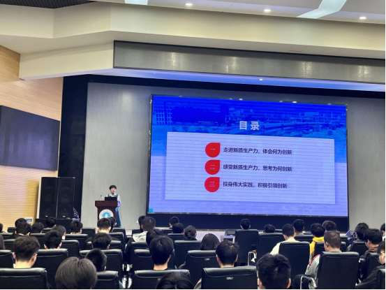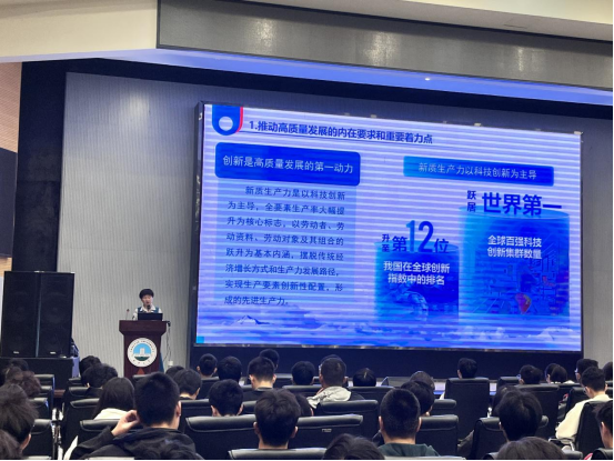 经理崔艳荣以此为切入点,首先向同学们阐述了新质生产力的由来、基本内涵和本质特点,并列举了以“5G+北斗”、自主超导量子计算机等新质生产力的代表。然后,崔经理从发展新质生产力是推动高质量发展的内在要求和重要着力点等5个方面详细讲解了国家为何要大力发展新质生产力。最后,崔经理鼓励同学们胸怀“国之大者”,增强以新质生产力发展推动强国建设、民族复兴的使命感责任感,并且要强化创新创业能力培养,在夯实专业理论的基础上激发创造热情、增强创业本领。