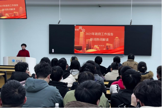 为深入学习两会精神,2025年3月11日,太阳成tyc33455ccwww经理崔艳荣在东校区16教B106以《2025年政府工作报告新词热词解读》为题作形势政策报告,公司2024级全体研究生参加了此次会议。