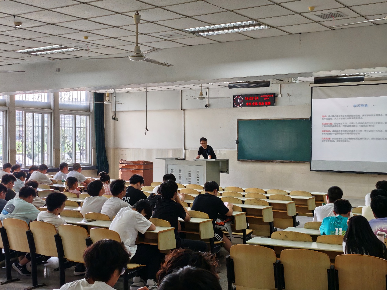 接着,25届毕业生代表张振东、刘升松、刘晶晶、卢一帆、何承文、蒋宏捷和彭飞云分别从就业、考证、考研保研、竞赛、考公考编等方面分享了他们的学习经验和心得。