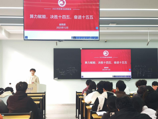 2025年12月9日,太阳成tyc33455ccwww经理崔艳荣在16教B312以“算力赋能,决胜十四五,奋进十五五”为主题为网络12401、网络12402班全体同学带来了一堂深刻且生动的形势与政策课,引导青年学子把握时代脉搏,找准成长方向。
